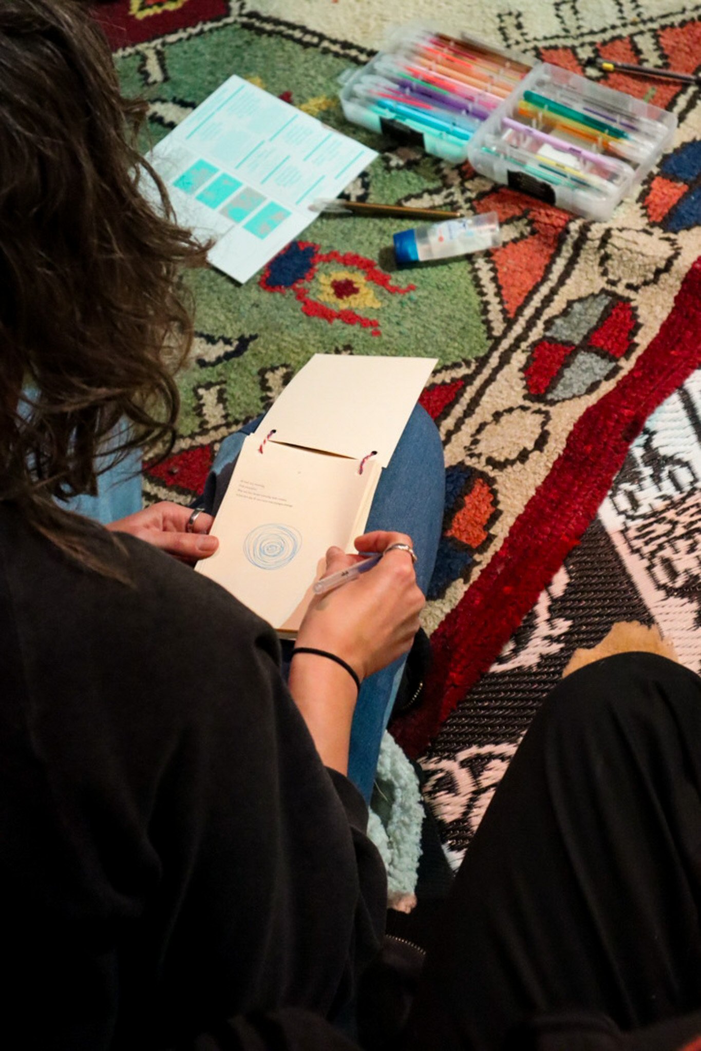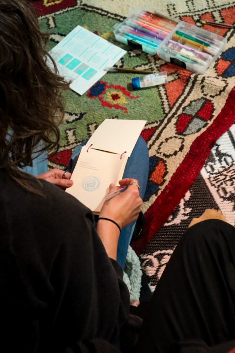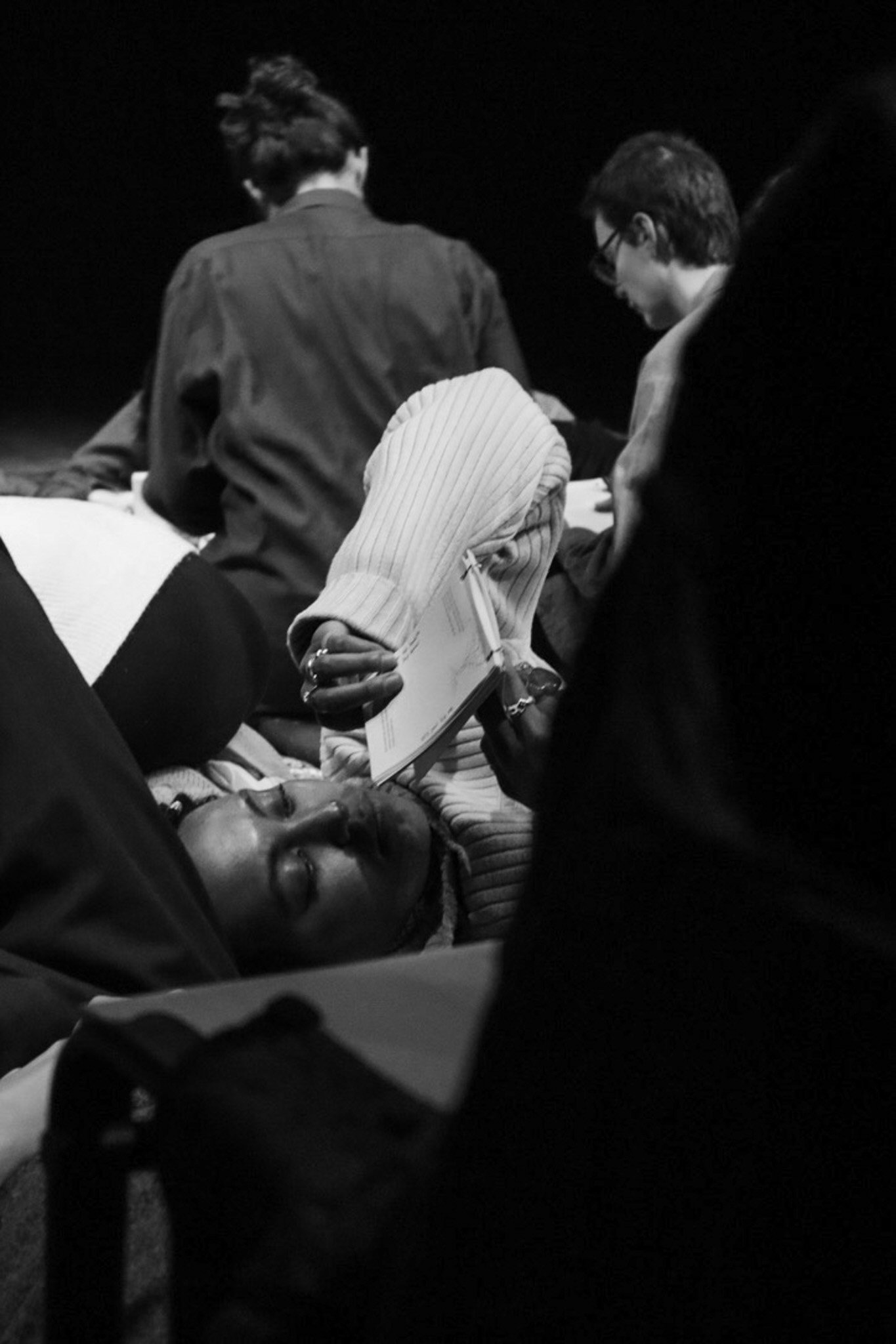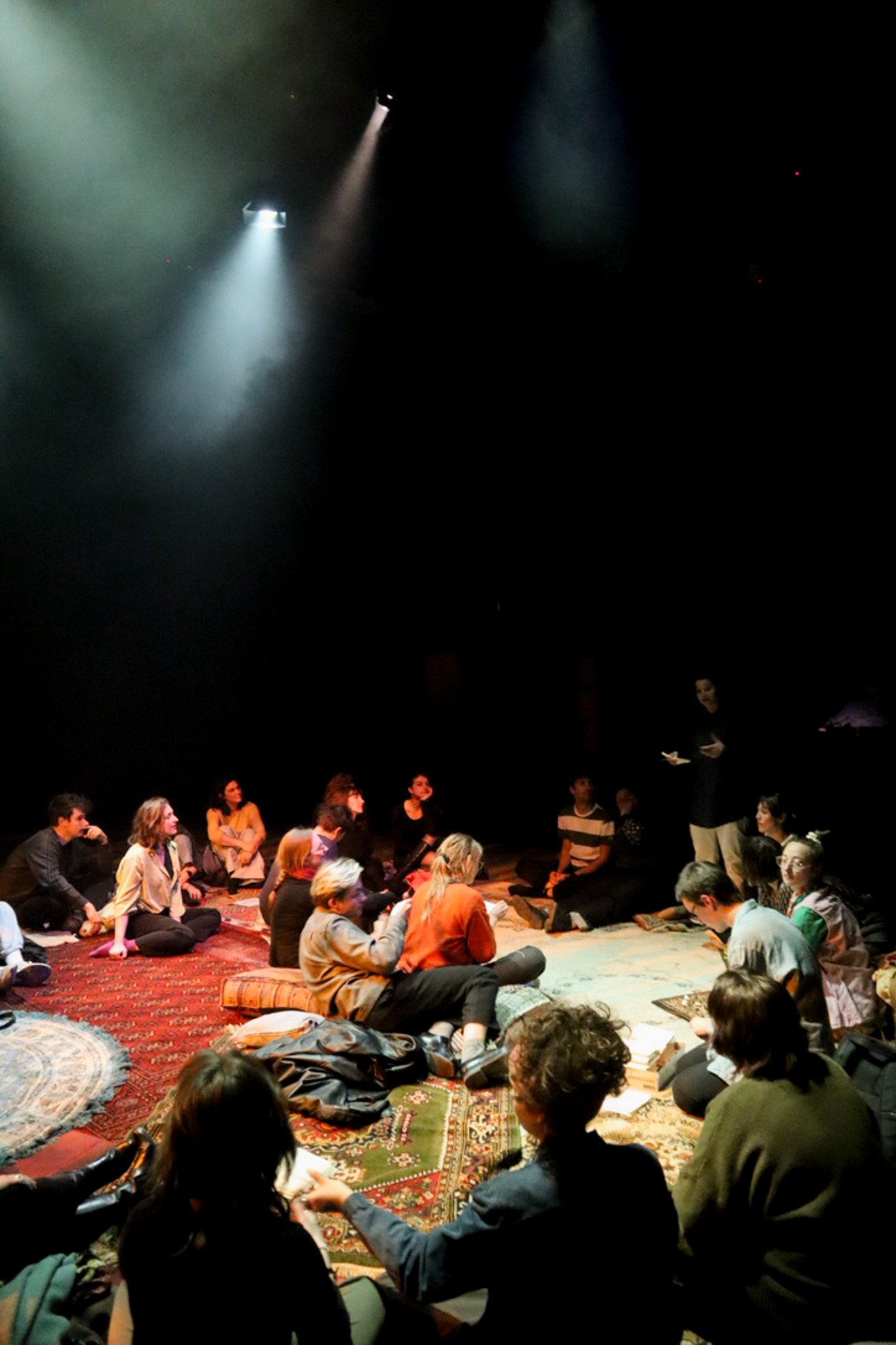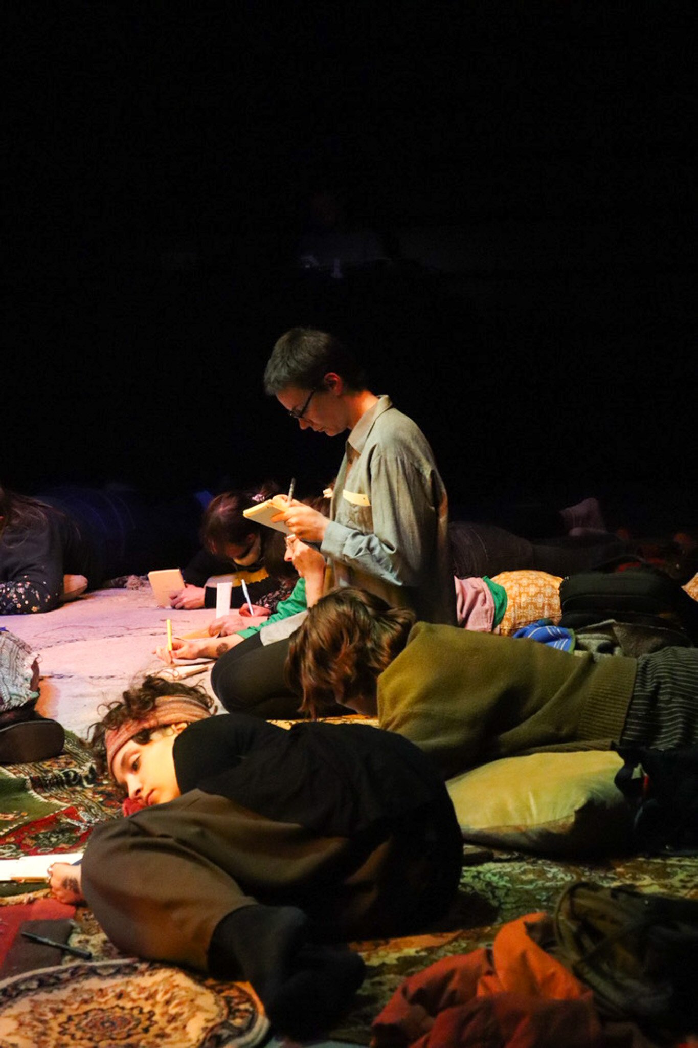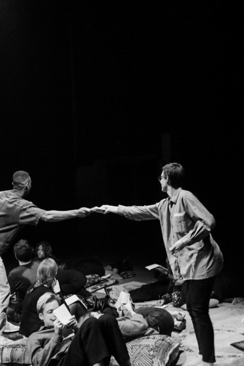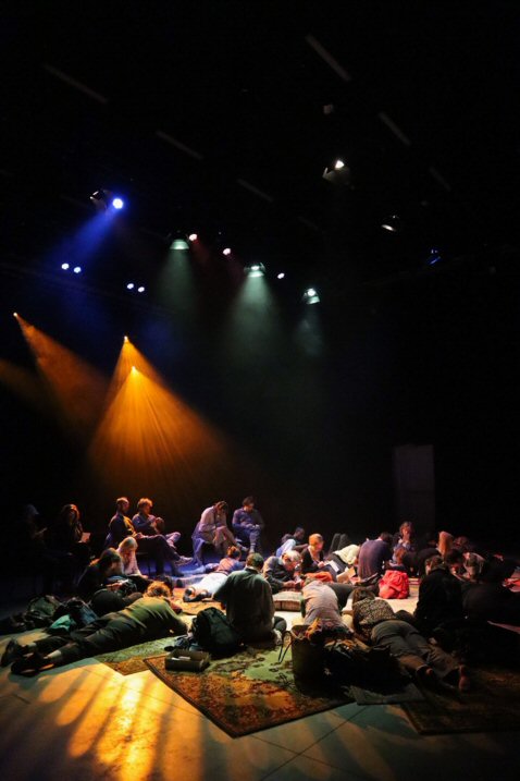 In de intieme ‘relaxed performance’ Verveldrang zit, ligt, danst … het publiek op tapijten, kussens en stoelen terwijl ze luisteren naar zes verhalen van mensen die, elk op hun eigen manier, in een ‘wachtkamer’ hebben gezeten, of zitten, tussen twee werkelijkheden, in een liminale fase tussen ‘niet meer’ en ‘nog niet’. Je wordt zacht door het geheel begeleid met behulp van muziek, twee performers en een kunstig boekje dat uitnodigt om in te schrijven of tekenen.